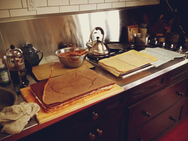 The cake I made is a tried and true, dead impressive, absolutely delicious recipe from Gourmet magazine – the recipe may be found here.  I doubled it.