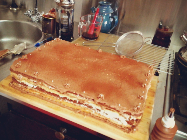 I took a week to bake a cake. Each evening I made one component of it and, on Saturday, with parts assembled, it became a most delicious 12 layer mocha cake. It was a cake I had offered to bake for a friend’s 40th birthday. I enjoy a cake challenge and must admit, I was particularly satisfied with this one. I had a cake in my mind’s eye, [wife edits: my mind’s tasting eye – is there such a thing? It would look weird I’m sure if there was one], and slowly, very slowly, small efforts over limited time, and voila, a masterpiece of European elegance and sophistication with North American proportions – it was to feed 50 people after all.   And it did.